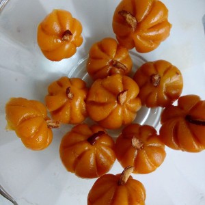 取一面团揉城乒乓球大小,用汤匙压成南瓜状,用红枣丝做藤