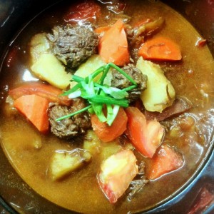 准备食材,牛肉一斤量,两个土豆,番茄两个(中型的可以放三个)胡萝卜一根,小葱一小把,八角4颗,干辣椒4个,生姜一小个