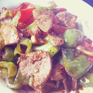 6、倒入青红椒一起炒,快起锅之前倒入猪肝,把准备好的料汁【老抽,醋,鸡精,耗油】沿着锅边倒入,盖上盖子焖一会,