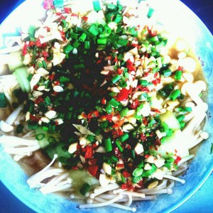 黄瓜薄片中心放入几根金针菇,然后向一个方向卷起