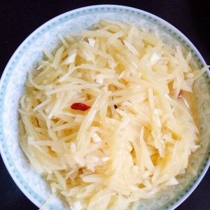 油热后放入蒜和辣椒炝锅后放入土豆丝翻炒,(可加少量水)待土豆八成熟时放盐,糖。