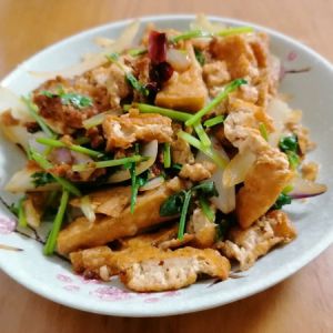 洋葱,煎豆腐条放进去,加入生抽酱油耗油,翻炒,因为豆腐是炸过的,洋葱炒熟就可以出锅了。煎豆腐是现炸的,洋葱和豆腐一起下锅就行,如果炸豆腐在冰箱里放两天了,就先炒豆腐,因为洋葱很容易熟。炒豆腐干的可以加点水,直到豆腐炒透了再放洋葱。