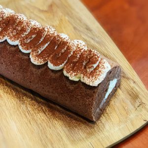 在定型好的蛋糕卷上挤上多余的奶酪糊、撒上可可粉,最后的装饰就做好啦。
