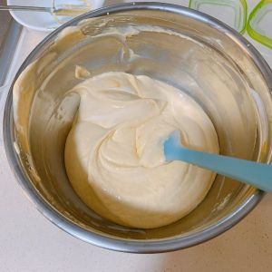 奶锅中加入打散的蛋黄 小火不停搅拌直至粘稠 放入冰箱冷藏降温
