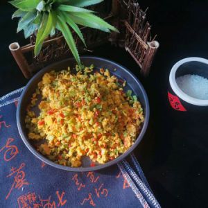 切好的苦瓜丁放碗里,碗里加鸡蛋,盐胡椒粉