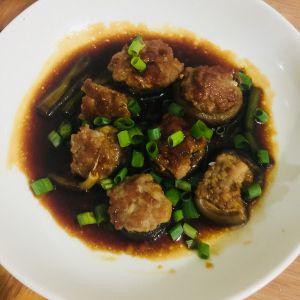 把放有肉沫的一面朝下煎 煎至金黄色再翻面煎五分钟 用小火煎 再放生抽 蚝油 鸡精 少量盐 料酒 葱姜 放一小碗水用中火慢慢十五分钟 最后放点淀粉收汁 装盘