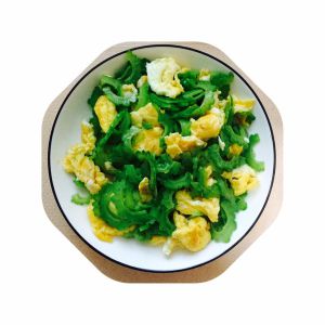 锅中再加适量油,开大火,将苦瓜片倒入锅中迅速翻炒,两分钟后倒入鸡蛋块,翻炒均匀,加入适量盐和味素,翻炒均匀后即可盛出。