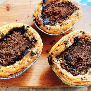 将巧克力酱抹在烤好的蛋挞上,撒上适量的可可粉就做好了;