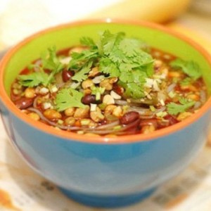 把泡好的红薯粉条在开水中烫后捞出,加入炒好的卤撒上葱花、酥黄豆、花生即可。