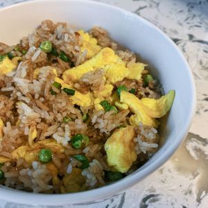 锅内再加入适量油,先下青豆翻炒到颜色变绿,然后倒入米饭炒散,加入生抽翻炒上色