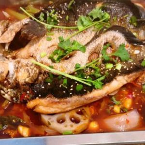 配菜放盘底,家里如果没有加热的器具可以把炸好的鱼放汤料里煮会再装盘