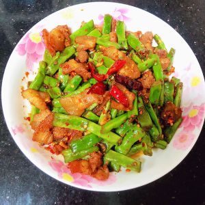 倒入四季豆干煸,一遍翻炒,一边用锅铲按压。四季豆比较难熟,需要多煸炒一下,一定得熟透。