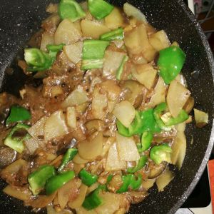柿子椒切块、土豆切片备用(土豆片切2~3毫米厚口感绵软,如果喜欢吃脆口的可以切薄片。另外新土豆淀粉含量低,口感也是脆的,个人感觉更适合做土豆丝,这道菜我用的是老土豆)。