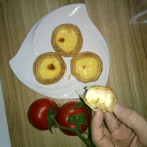 接着把蛋挞液倒入蛋挞皮中(我倒的九分满,是非常刚刚好)。