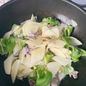 最后一步放入土豆片跟尖椒,因为土豆片不好熟,所以分次放入少量水