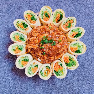 取一张豆皮,在一端摆好香葱,胡萝卜丝,黄瓜丝,卷成原卷,每隔两厘米左右斜刀切好,摆盘备用。