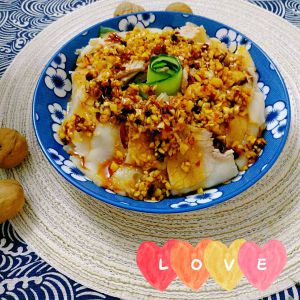 调料汁:蒜切末,加一点盐,鸡精,生抽,香醋,糖,辣椒油,香油。