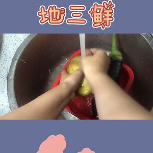 接着锅底留一点油,葱姜蒜炒香,放入土豆,茄子,青椒