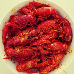 锅中烧水至开后,加入料酒适量,同时把小龙虾放入锅中,带小龙虾全部变红后,捞出放入盛有冷水的盆中备用。