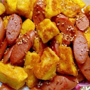 油锅内下入火腿丁煎炒至火腿表面微微变色后,下入刚刚炸好的馒头丁翻炒
