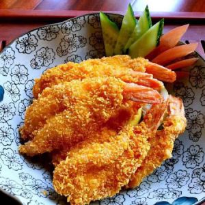 锅里油烧热后转中火,下虾炸制表皮酥脆,虾肉易熟,注意别把面包糠炸糊了。