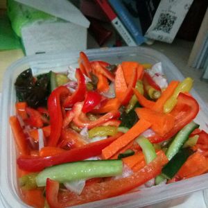 把胡萝卜切块,萝卜切片,木耳泡发,甜椒切条,黄瓜切条