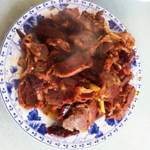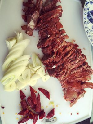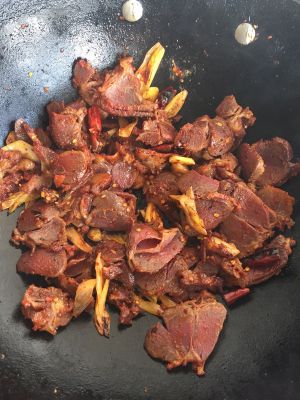 倒少量油,加入葱蒜和干辣椒炒10秒,再放入切好的牛肉爆炒。然后加入适量花椒面,辣椒面。干的话放入一点水即可。不要放盐哦,因为牛肉已经是熟的。