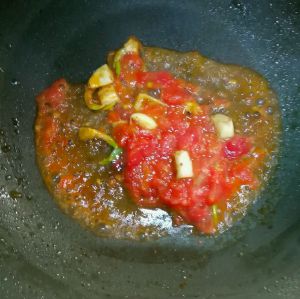 锅中油全部倒出,下蒜、葱炒香,倒入蕃茄碎、生抽、耗油翻炒。