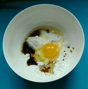 碗中放入淀粉、面粉,打入一个鸡蛋,放两勺生抽,再倒入腌茄子出的水,再加少许水调成稀面糊。