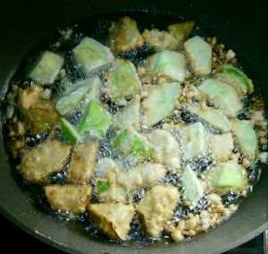 锅中放油,八成热转中火下茄子炸,炸至两面金黄即可。