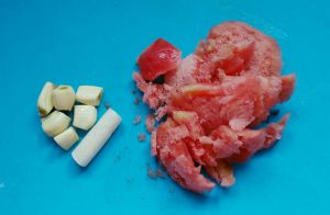 蕃茄去皮切碎,蒜切块,葱切段。