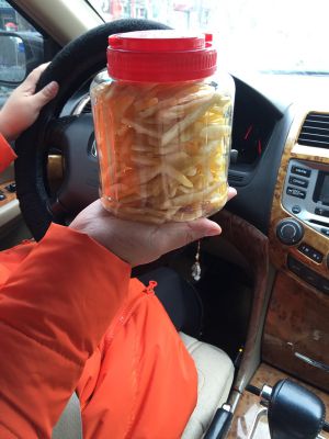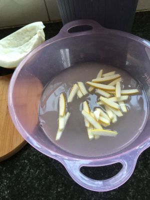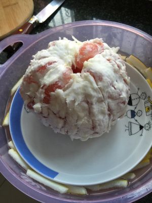 用重点的东东压住,浸泡充分。隔两个多小时挤干水份换淡盐水,三次就可以了,挤干捞出称重。