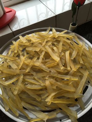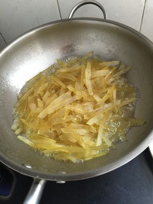 准备冰糖和少量清水放入锅中煮成糖水,倒入柚子皮翻炒均匀至透明。