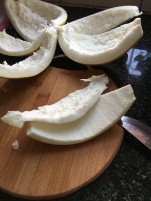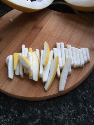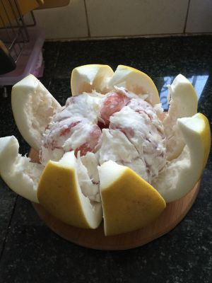 新鲜柚子用洗洁精和细盐依次洗净,切牙取肉。