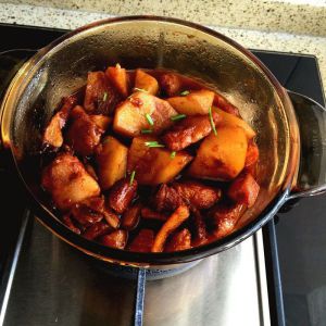 再加入备好的土豆、酱油、糖、豆瓣酱放入锅里翻炒均匀