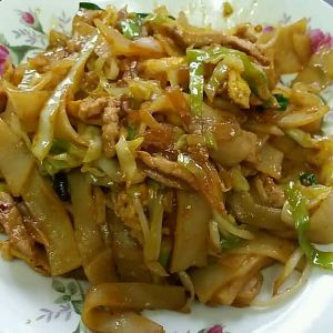 到花生油50g,一定按照顺序放菜。油热后先放洋葱翻炒,半熟后卷心菜翻炒,然后是豆芽菜,鸡蛋条,韭菜,肉,河粉,最后一步将调好的酱汁倒在上面翻炒!
