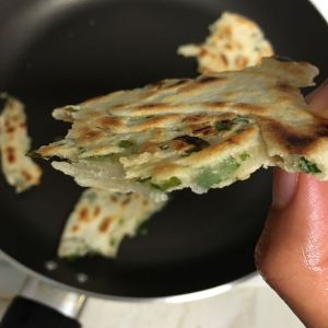 平底锅小火慢慢烙熟,两面变成金黄色就搞定啦,为了松软一些,烙完摔打一下,跟我妈妈学的。