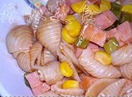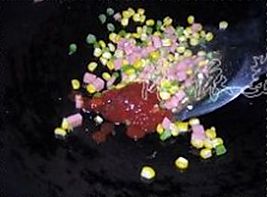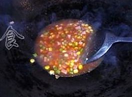 热油锅,放玉米粒、方腿粒、菜心梗下锅,炒熟,放一点点盐调味;