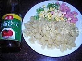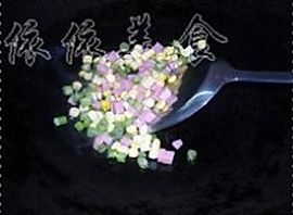 甜玉米切粒,方腿肉切粒,菜心梗切粒;
