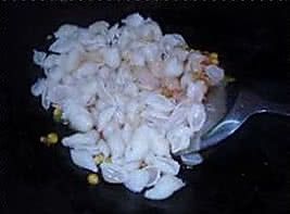 放进贝壳粉,翻炒均匀,煮至收干芡汁;