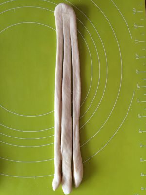 将发酵好的面团排气后,等分成6份,把一份搓长擀平,再用刮刀切成三条