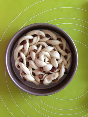 取两条辫子盘成圆形放入6寸烤盘,放温暖湿润处再次发酵半小时