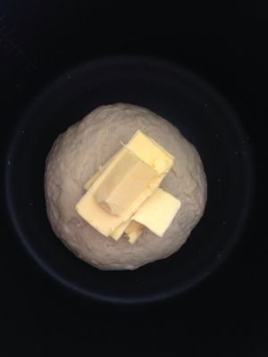 将黄油、葡萄干、蛋黄液除外的所有食材放一起搅拌至面团有弹性后,放入黄油