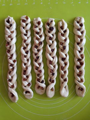 用编辫子的方式将葡萄干夹在里面编成辫子