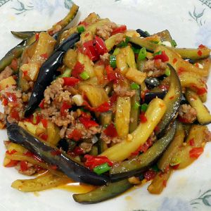 然后加入茄子 调味 加糖.生抽.鸡粉.加一点热水闷茄子软,最后生粉勾汁,撒上葱花