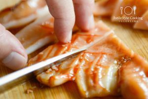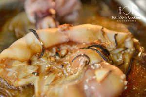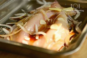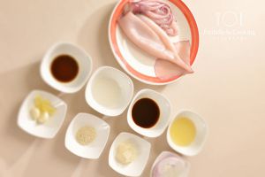 洋葱丝、姜、蒜末、酱油、味霖、冰糖、醋和1 杯热水调制成浓稠的烧烤汁,腌制鱿鱼1小时。