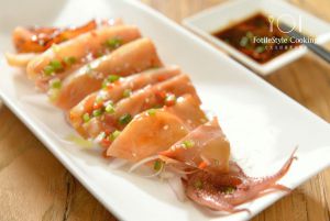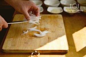 洋葱洗净切丝,蒜切成碎末。净鱿鱼用厨房用纸吸干表面水分,在表面用刀划出十字形花纹。