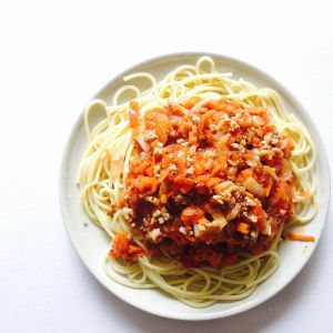 第二步:热锅下黄油,炒香洋葱后放肉末(牛肉末猪肉末都行)肉末炒至变色后加入切成丁的番茄