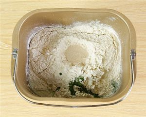 把除黄油外所需材料先液体后固体放入面包桶,启动面包机和风程序