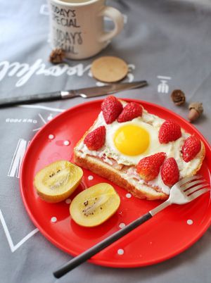 三、在培根附近挤上色拉酱,在切好草莓摆盘,营养丰富的草莓吐司做好啦!可以发挥想象力,在吐司上放各种能想到的蔬菜,水果!